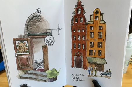 I have great techniques to quickly compose a street scene: sketch with a Micron pen and then paint it with quick washes from my travel palette... everything fits in your backpack.